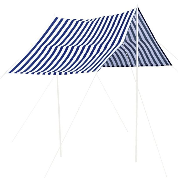 • WYTRZYMAŁY - Wykonany z wytrzymałego poliestru. Baldachim jest w paski biało-niebieskie. Jego konstrukcja przypomina namiot.