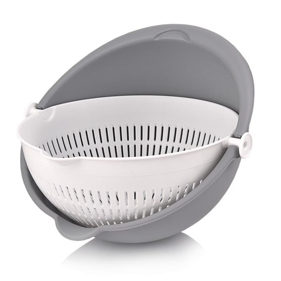 Miska z obracanym cedzakiem. Sprawdzi się do mycia oraz odcedzania zarówno warzyw i owoców jak i makaronu. Wykonana z tworzywa. Bezpieczna dla zdrowia