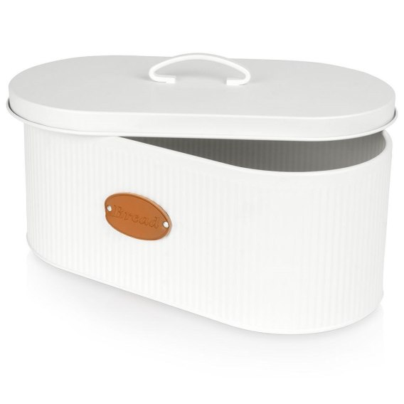 Pojemny chlebak wykonany z wysokiej jakości metalu w białym kolorze. Posiada wygodną pokrywkę z uchwytem oraz napis Bread na skórzanej etykiecie.
