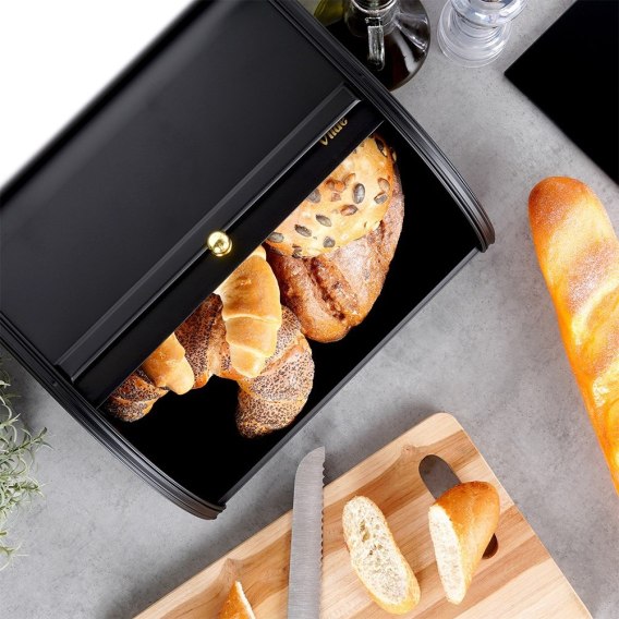 Pojemny chlebak wykonany ze stali nierdzewnej w kolorze czarnym. Otworzymy i zamkniemy go w wygodny sposób. Pozwoli zachować świeżość pieczywa.