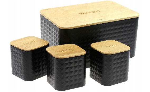 Elegancki zestaw w którego skład wchodzi chlebak oraz 3 pojemniki. Całość wykonana ze stali nierdzewnej, pokryta półmatowym lakierem. Pokrywa z drewna bambusowego łatwo otwiera się i zamyka oraz jednocześnie pełni funkcję deski do krojenia. Efektowna, praktyczna i zarazem solidna konstrukcja. Pojemniki posiadają szczelne pokrywki (także z drewna bambusowego) tak więc nadają się do szerokiego asortymentu. Podstawowe zastosowanie to herbata, kawa, cukier.