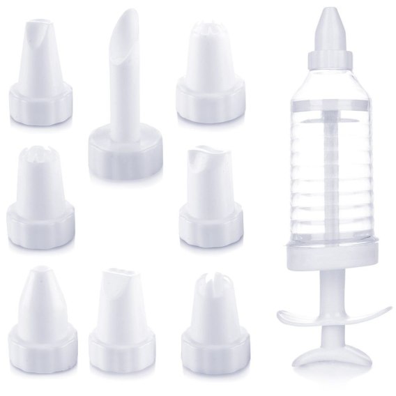 Dekorator w formie strzykawki z wymiennymi końcówkami do nadziewania oraz dekorowania deserów, ciast, tortów, babeczek.