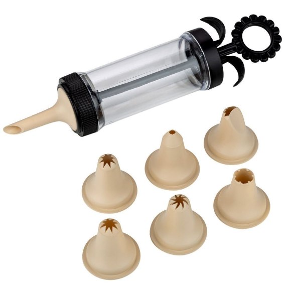 Dekorator w formie strzykawki z wymiennymi końcówkami do nadziewania oraz dekorowania deserów, ciast, tortów, babeczek. W zestawie 7 końcówek.