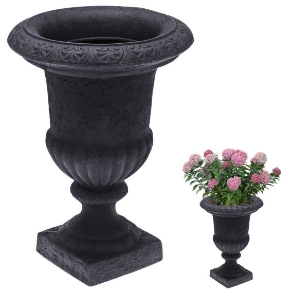 Doniczka w kształcie kielicha wykonana z tworzywa imitującego kamień w kolorze antracytowym. Odporna na warunki atmosferyczne. Idealna do ogrodu, na taras czy podjazd przed domem.