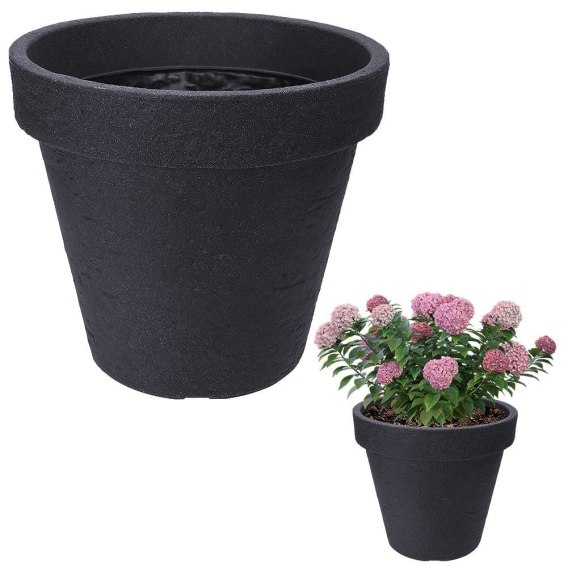 Doniczka wykonana z tworzywa imitującego kamień w kolorze antracytowym. Odporna na warunki atmosferyczne. Idealna do ogrodu, na taras czy podjazd przed domem. Wysokość 35 cm.