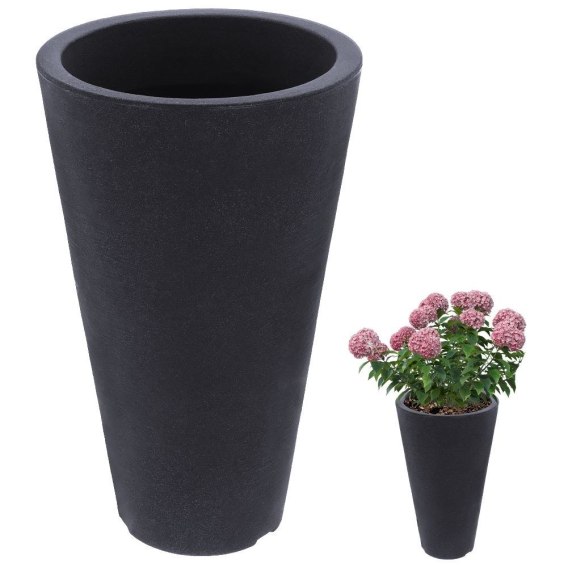 - WYTRZYMAŁA - Wykonana z wysokiej jakości tworzywa imitującego kamień w kolorze antracytowym. Tworzywo to jest lekkie, a jednocześnie bardzo wytrzymałe. Doniczka ma stożkowy wygląd, dzięki czemu prezentuje się bardzo efektownie.