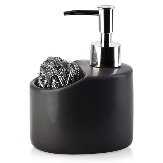 Dozownik płynu do naczyń wraz z gąbką oraz miejscem do jej przechowywania. Wykonany z ceramiki w kolorze czarnym. Nowoczesna forma pasuje do każdego wnętrza.