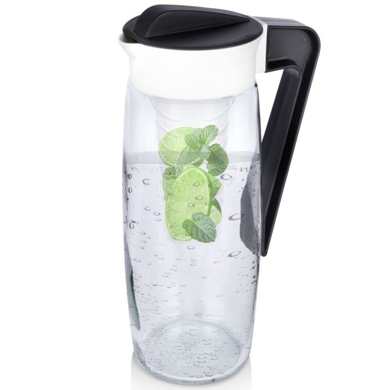 Uniwersalny, szklany dzbanek do napojów z pokrywką i wkładem do owoców. Idealnie sprawdzi się do wody, serwowania soków, lemoniady, herbaty mrożonej, kompotu itp.