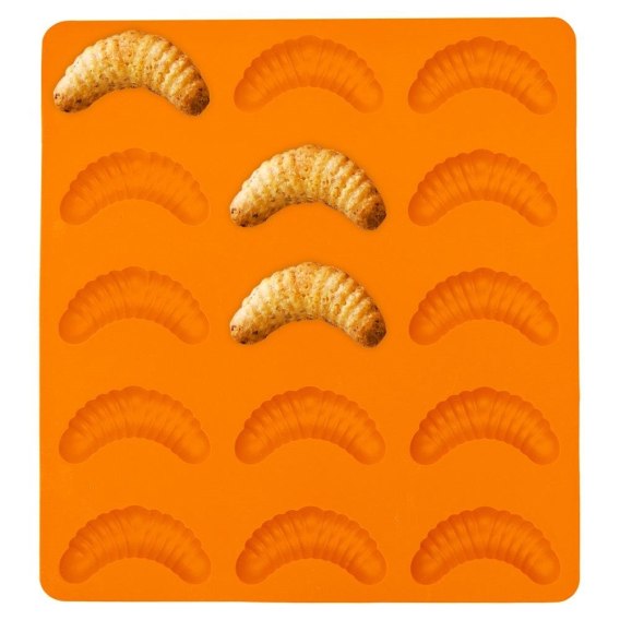 Pomarańczowa forma silikonowa do pieczenia kruchych rogalików. Jest lekka, elastyczna i zajmuje mało miejsca. Materiał odporny na zmiany temperatury.