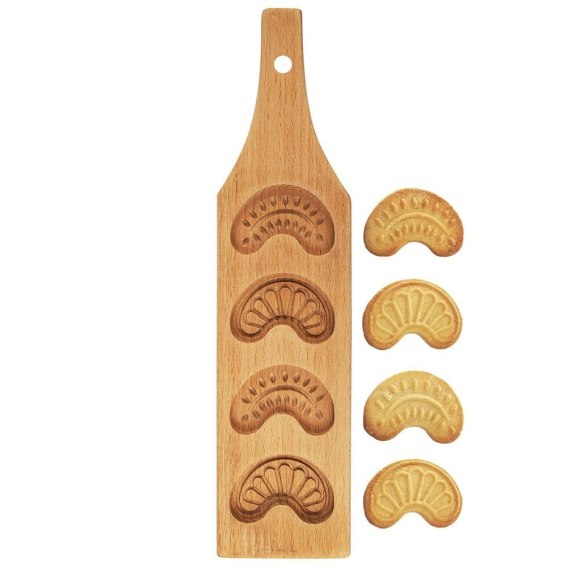 Forma umożliwiająca przygotowanie rogalików, ciasteczek, pierników a także zdobionego masła. Żłobione wzory sprawią, że wypieki będą efektowne. Wykonana z drewna bukowego.