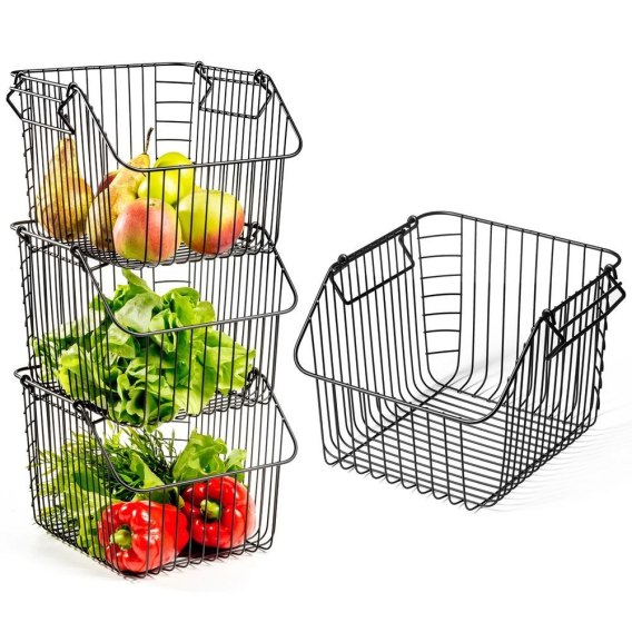 Kosz do przechowywania owoców warzyw wykonany z czarnego metalu. Koszyki można układać jeden na drugim tworząc wyjątkowy regał kuchenny.