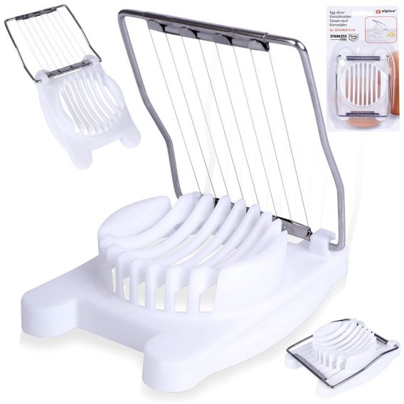 Krajalnica zapewni wygodne plastrowanie jajka. Ergonomiczna konstrukcja, wykonana z trwałych materiałów. Z jej pomocą równomiernie pokroimy jajko na plasterki, możemy wykorzystać ją również do krojenia owoców lub warzyw. Oryginalny produkt holenderskiej marki Alpina. Wyprodukowano zgodnie z europejskimi standardami.