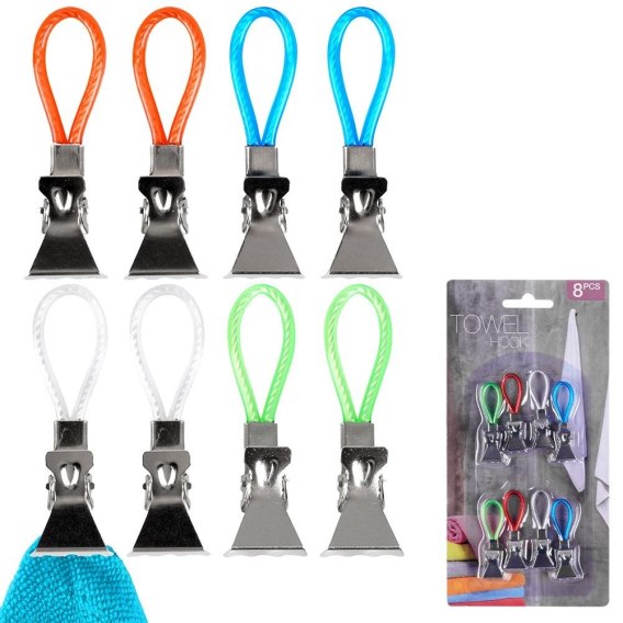 Zestaw 8 szt. praktycznych klipsów do powieszenia ręczników lub ścierek. Haczyki sprawdzą się zarówno w łazience jak i kuchni.