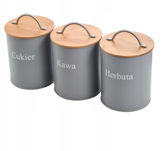 Zestaw 3 pojemników do przechowywania herbaty, kawy oraz cukru. Pojemniki wykonane z lakierowanej stali nierdzewnej. Każdy pojemnik posiada pokrywkę, dzięki czemu do pojemnika nie dostaje się powietrze i kawa czy herbata nie wietrzeje. Napisy na pojemnikach w języku polskim.