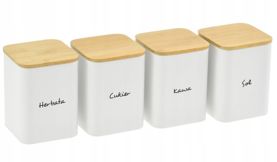 Zestaw 4 pojemników do przechowywania herbaty, kawy, cukru oraz soli. Pojemniki wykonane z lakierowanej stali nierdzewnej. Każdy pojemnik posiada pokrywkę, dzięki czemu do pojemnika nie dostaje się powietrze i kawa czy herbata nie wietrzeje. Napisy na pojemnikach w języku polskim.