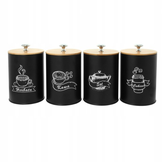 Zestaw 4 pojemników do przechowywania herbaty, kawy, cukru oraz soli. Pojemniki wykonane z lakierowanej stali nierdzewnej. Każdy pojemnik posiada pokrywkę, dzięki czemu do pojemnika nie dostaje się powietrze i kawa czy herbata nie wietrzeje. Napisy na pojemnikach w języku polskim.