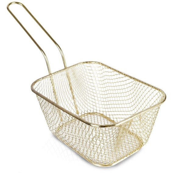 Koszyk z uchwytem do efektownego serwowania frytek, grillowanych warzyw, nuggetsów. Wykonany z metalu w złotym kolorze.