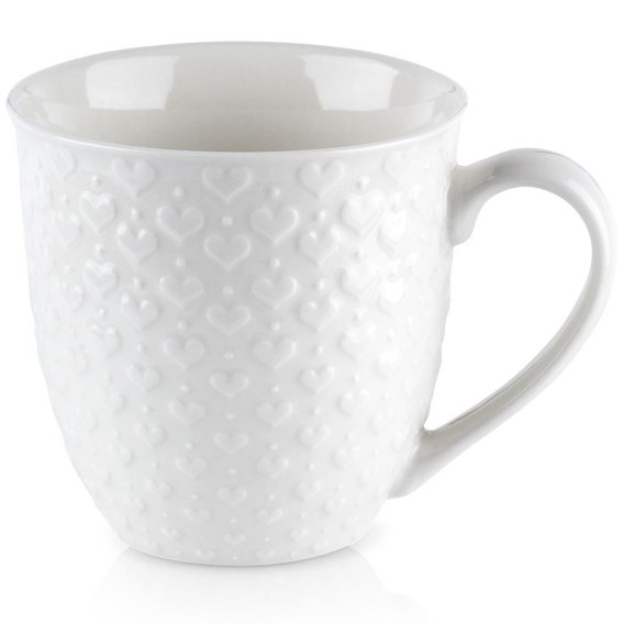 Kubek ceramiczny w białym kolorze dekorowany sercami. Sprawdzi się w codziennym użytku jak i podczas wyjątkowych okazji. Nadaje się do mikrofalówki oraz zmywarki.