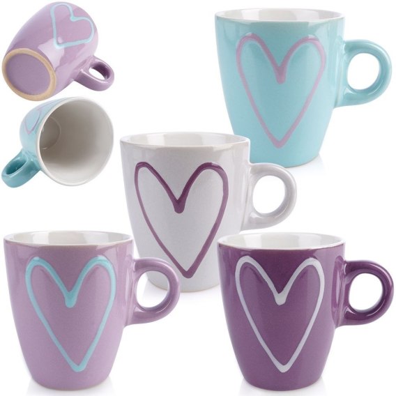 - CERAMICZNE - Wykonane z wysokiej jakości ceramiki w czterech różnych kolorach, każdy z kubków ma motyw serca. Odpowiednio użytkowane posłużą długie lata.