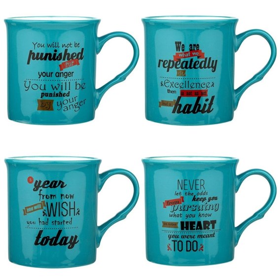Komplet czterech kubków wykonanych z porcelany w turkusowym kolorze z sentencjami. Idealne do picia kawy, herbaty oraz innych napojów. Nadają się do zmywarki.