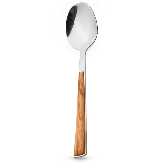 Łyżeczka do herbaty o długości 18 cm. Wykonana ze stali nierdzewnej w srebrnym kolorze, posiada uchwyt imitujący drewno. Nadaje się do mycia w zmywarce do naczyń.