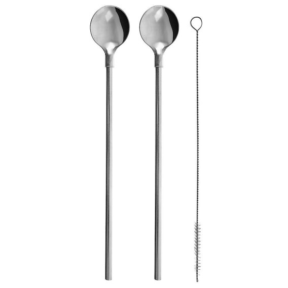 Zestaw dwóch łyżeczek koktajlowych z funkcją słomki. W zestawie dodatkowo szczoteczka do czyszczenia. Łyżeczki wykonane są ze stali nierdzewnej.