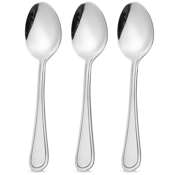 Zestaw trzech łyżek obiadowych o długości 20,5 cm. Łyżki wykonane są ze stali nierdzewnej w srebrnym kolorze, posiadają efekt młotkowanej stali. Nadają się do mycia w zmywarce.