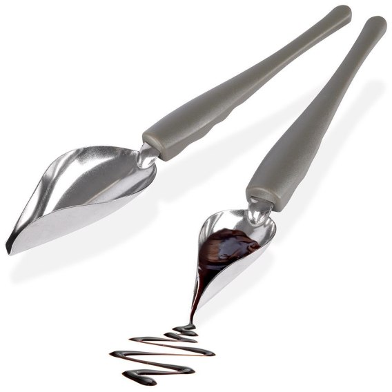 Zestaw dwóch łyżek o długości 20 i 18 cm do dekorowania ciast, tortów, potraw sosami słodkimi oraz wytrawnymi. Wykonane ze stali nierdzewnej oraz tworzywa.