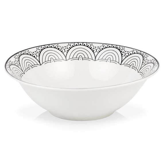Duża miska o pojemności 1,4 litra i uniwersalnym zastosowaniu. Wykonana z porcelany w białym kolorze. Posiada efektowny, czarny dekor. Nadaje się do zmywarki.