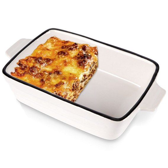 Żaroodporne naczynie do zapiekania lasagne, ziemniaków, pieczonych warzyw, zapiekanek itp. Naczynie wykonane z białej porcelany z czarnym brzegiem.