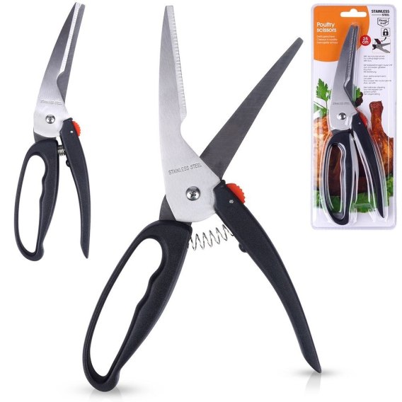 Ostre nożyce do cięcia surowego, pieczonego, grillowanego drobiu. Praktyczny system blokowania - wystarczy nacisnąć przycisk. Wykonane z wysokiej jakości stali nierdzewnej oraz tworzywa.