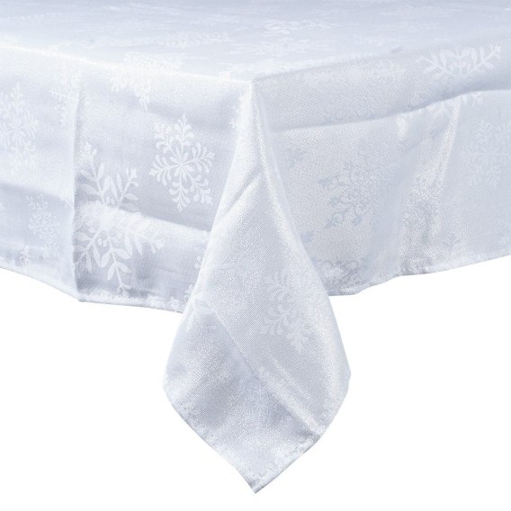 - Trwały i odporny - Obrus wykonany z poliestru w kolorze białym z piękną, srebrną nitką oraz wytłaczanymi śnieżynkami.