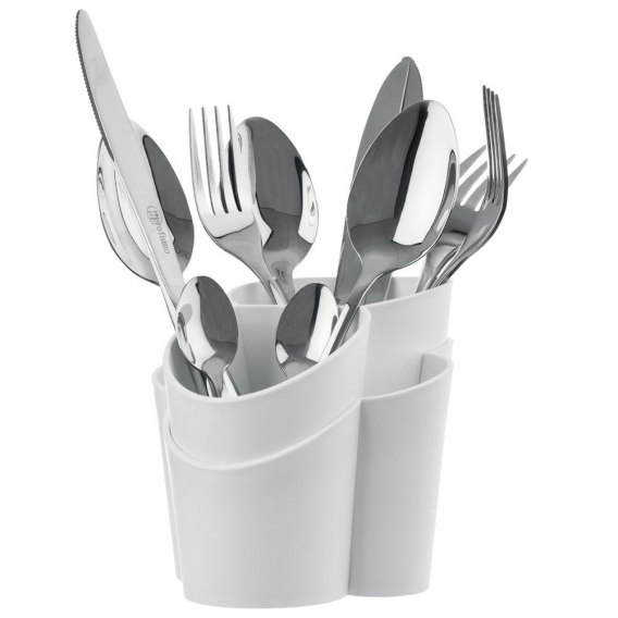 Pojemnik wykonany z wysokiej jakości tworzywa w kolorze białym. Świetnie sprawdzi się do ociekania oraz przechowywania sztućców. Posiada cztery przegródki.