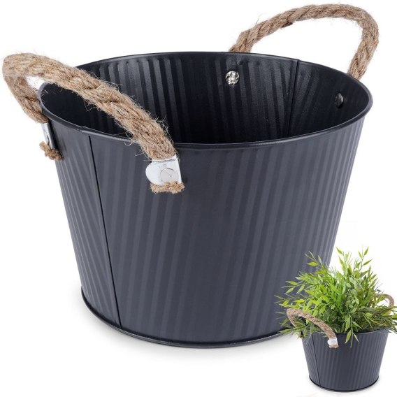 Osłonka na doniczkę z ryflowanym frontem. Wykonana z ocynkowanego metalu w czarnym kolorze. Do zastosowania wewnątrz oraz na zewnątrz pomieszczeń.