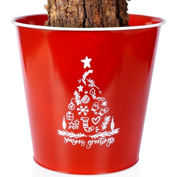 Świąteczna osłonka na rośliny wykonana z metalu w kolorze czerwonym. Posiada dekor w postaci choinki w kolorze białym. Prezentuje się bardzo efektownie.