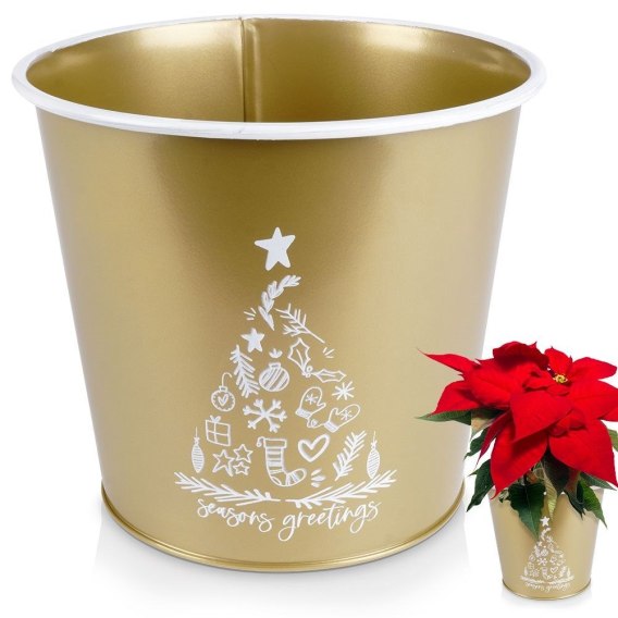 Świąteczna osłonka na rośliny wykonana z metalu w kolorze złotym. Posiada dekor w postaci choinki w kolorze białym. Prezentuje się bardzo efektownie.