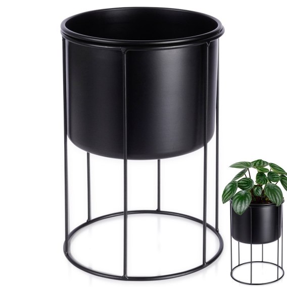 Czarna, metalowa osłonka na doniczkę usadowiona na stojaku w kolorze czarnym. Dzięki niej efektownie wyeksponujemy ulubione rośliny żywe lub sztuczne.