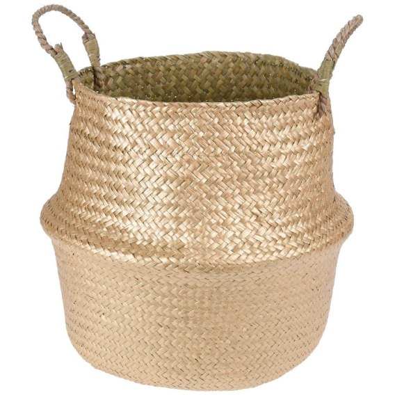 Naturalny kosz w kolorze złotym z uchwytami na doniczkę z rośliną.