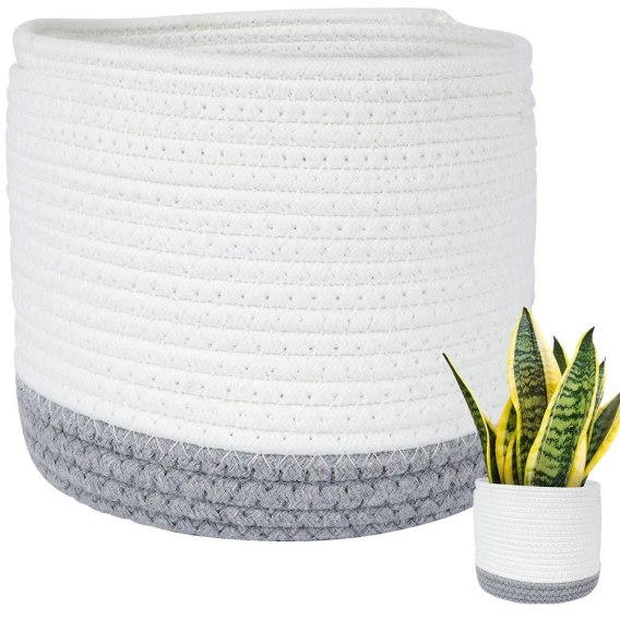 Bawełniany koszyk w kolorze biało szarym. Wykorzystamy go jako osłonkę na doniczkę lub do przechowywania wszelkich drobnych przedmiotów, kosmetyków.
