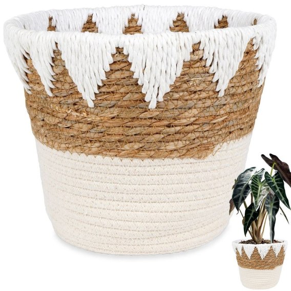 Dekoracyjna osłonka wykonana z wikliny, bawełny oraz papieru. Utrzymana w stylu boho. Idealna do każdego wnętrza. Sprawdzi się do roślin żywych oraz sztucznych.