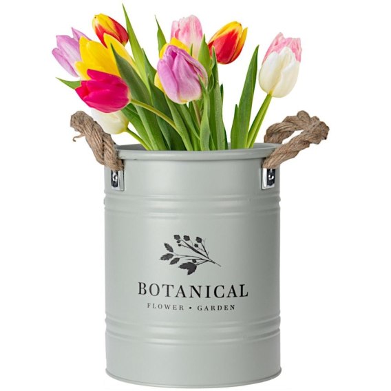 Oryginalna metalowa osłonka na doniczkę w stylu retro. Posiada dwa uchwyty wykonane z parcianego sznura. Nadaje się do użytku wewnątrz oraz na zewnątrz pomieszczeń.