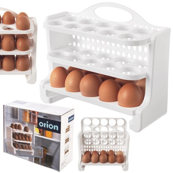 Organizer do przechowywania 30 jajek w lodówce na trzech różnych poziomach. Wykonany z tworzywa w białym kolorze. Możliwość umieszczenia go na drzwiach lodówki.