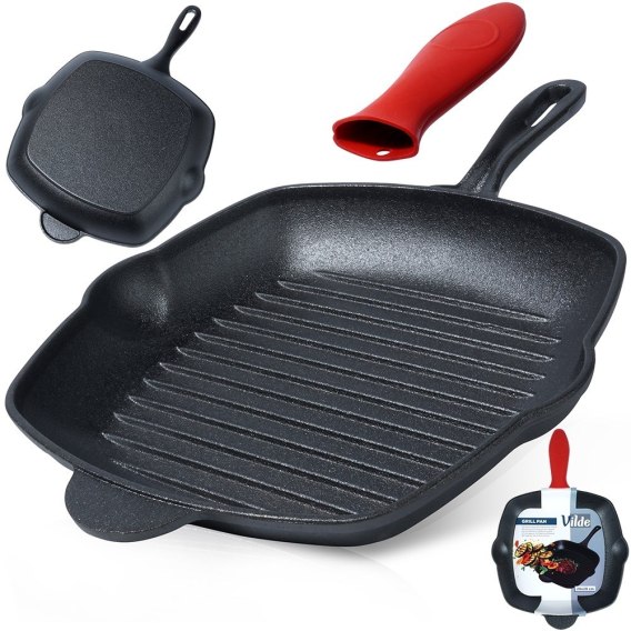 Patelnia kwadratowa z grillowym dnem wykonana z żeliwa w zestawie z silikonową nakładką na rączkę patelni. Można stosować ją na indukcji, w piekarnikach, na piecu i bezpośrednio na ogniu.