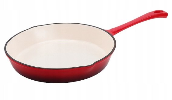 Specyfikacja: Średnica: 25 cm, Wysokość: 4 cm, Materiał: żeliwo emaliowane, Kolor: CZERWONY