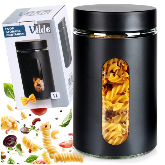 Szklany pojemnik idealny do przechowywania różnych produktów spożywczych. Szczelny dzięki zakręcanej pokrywce. Posiada czarne, matowe wykończenie.
