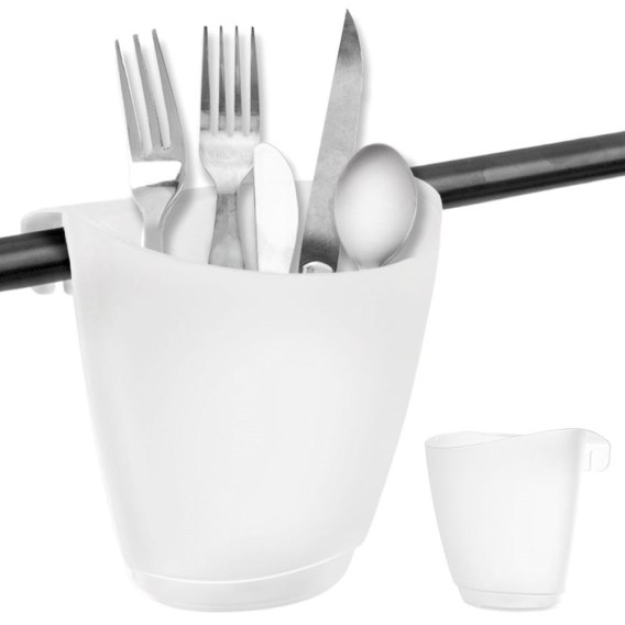 Pojemnik wykonany z wysokiej jakości tworzywa w kolorze białym. Świetnie sprawdzi się do ociekania oraz przechowywania sztućców. Pojemnik można zawiesić na relingu.