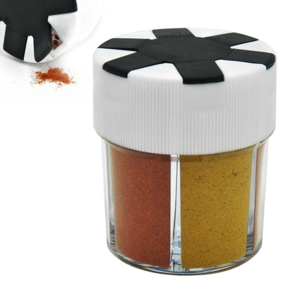 Niezwykle poręczny pojemnik do dozowania przypraw. Podzielony na 6 części w których znajdziemy: sól, pieprz, czosnek, chilli, curry, paprykę słodką.
