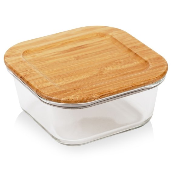 Szklany pojemnik z bambusową pokrywką i uszczelką. Idealny do przechowywania żywności i produktów spożywczych. Nadaje się do zmywarki i mikrofalówki.