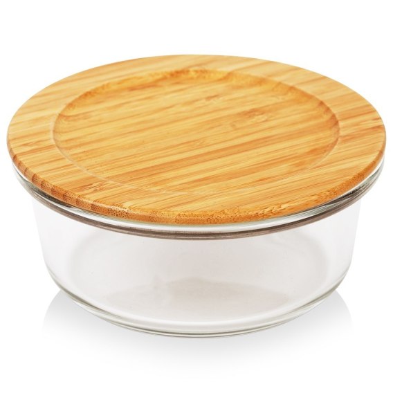 Szklany pojemnik z bambusową pokrywką i uszczelką. Idealny do przechowywania żywności i produktów spożywczych. Nadaje się do zmywarki i mikrofalówki.