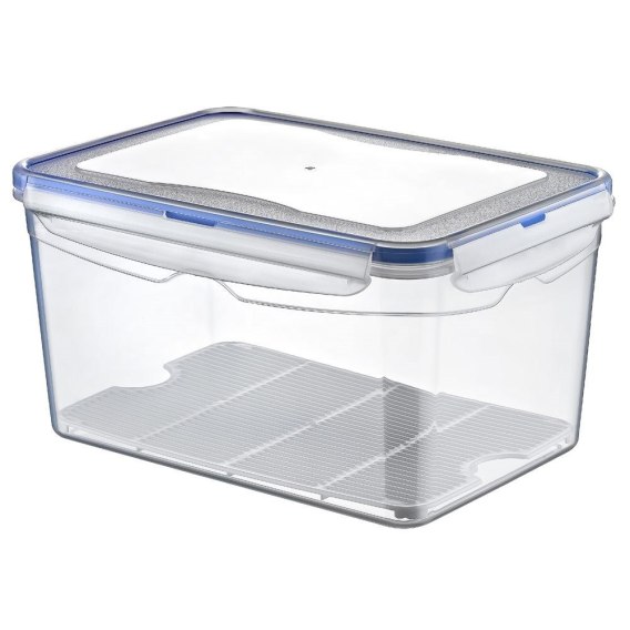 • WYGODNY W UŻYTKOWANIU - Wyposażony w specjalną kratkę gwarantującą odpowiednią cyrkulację powietrza. Dzięki niej przechowywane produkty spożywcze nie leżą na dnie pojemnika. Pokrywka jest wyposażona w cztery solidne klipsy, które umożliwiają pewne zamknięcie. Dodatkowo, pokrywka posiada uszczelkę, która zapewnia szczelność i świeżość przechowywanych produktów.